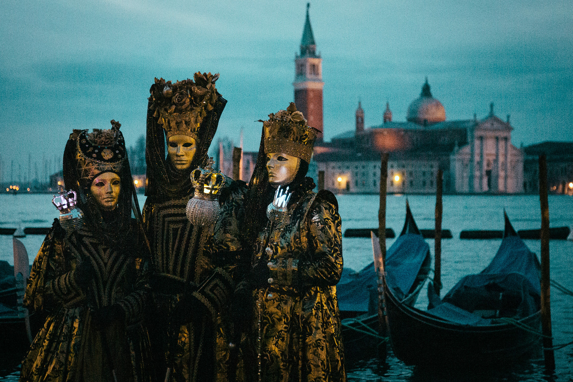 At sunrise on the day of the Carnival, in a still relatively empty Piazza San Marco, a few amazingly beautiful traditional masks pose silently for the joy of dozens of professional and amateur photographers.